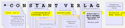 Constant Verlag is a growing on-line repository, currently containing more than 60 texts on digital art and infrastructure. Some of those texts were already available on our website, others only existed on our personal hard drives. Constant Verlag allows you to easily browse, search and print hidden treasures from the depth of Constants Archives. Enjoy texts in French, English, Spanish or Dutch; recent or as early as 1997 and written by various authors. As most texts have been released under open content license, you are invited to use, copy, modify and redistribute the material.