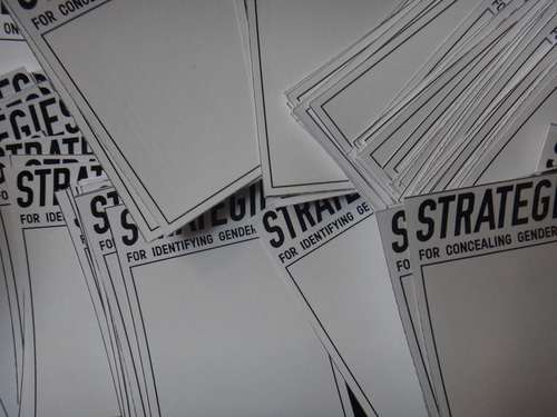 This workshop which explores how we parse gender and gender representation when others are divorced from our bodies. The workshop is structured around a kind of Turing test, in this case called the Strategies game. The Strategies game is a deliberately obfuscatory Turing test. Groups take on the role of either the agent trying to ascertain gender, or the agent trying to hide gender. All groups start by exploring their own cultural assumptions about gender and listing things that they see as essential signifiers, before engaging in a modified Turing test. In asking participants to consider strategies for concealing and identifying gender, and in playing out a modified Turing test, the goal is to tackle ideas of gender binaries, cultural gender scripts and requirements, the violence of forced disclosure, and the differing conditions under which we identify ourselves as gendered.